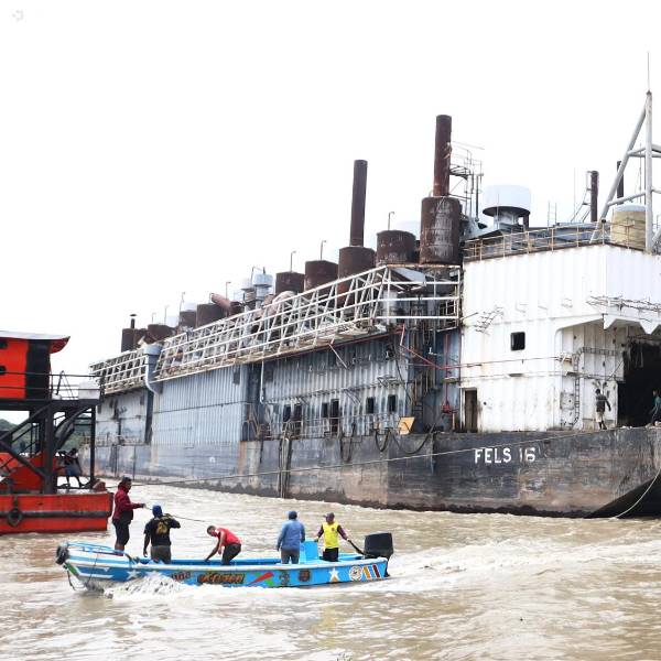 Varias embarcaciones remolcaron las dos barcazas que chocaron contra el puente basculante Durán-Santay hacia un puerto seguro para evitar que vuelvan a soltarse y queden a la deriva.