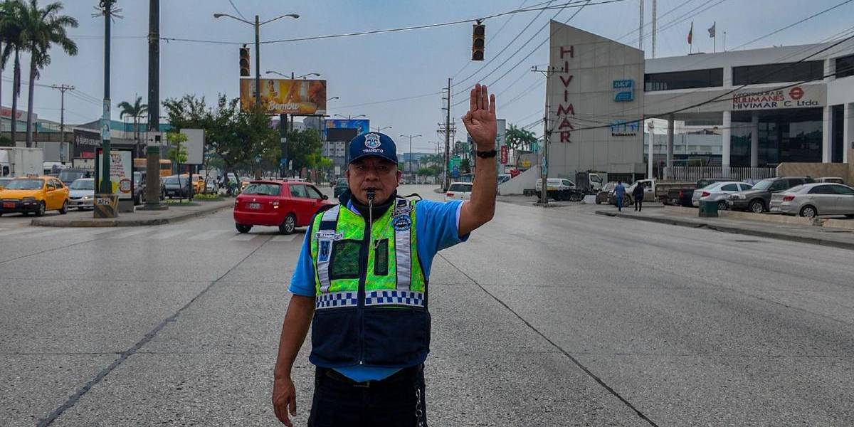 Imagen de un agente de tránsito realizando su trabajo en una calle del norte de Guayaquil, ante la falta de funcionamiento de un semáforo por los apagones.( )