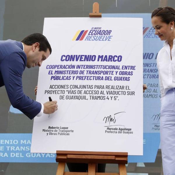 El ministro Roberto Luque y la prefecta del Guayas, Marcela Aguiñaga, firmaron un convenido de cooperación este viernes 8 de noviembre de 2024. Esto para construir las vías de acceso al viaducto sur de Guayaquil.