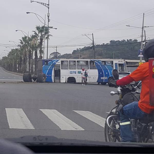 Un bus de transporte urbano de Guayaquil perdió sus ruedas traseras mientras transitaba en una avenida en el norte de la urbe, en la mañana de este viernes 28 de julio.