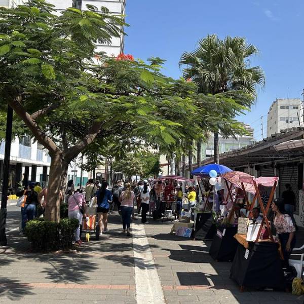 Desde las 08:00, el centro de Guayaquil cobra vida los domingos. Emprendedores empiezan a ensamblar sus puestos para colocar dulces, manualidades, pinturas, juguetes y más, a lo largo de la calle Panamá. Esto como parte del espacio comercial habilitado para ellos ese día.