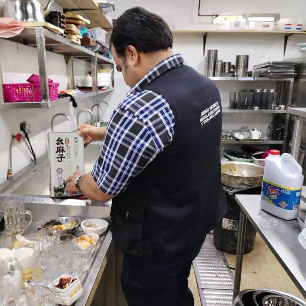 Imagen de un agente de Arcsa revisando el estado de insalubridad en un restaurante chino, en Guayaquil.( )