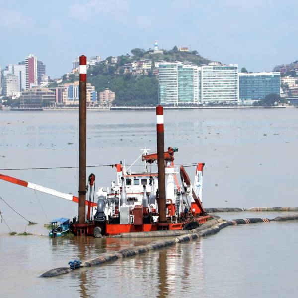 La draga debe extraer 6,28 millones de metros cúbicos de sedimentos, que se depositarán en un terreno en Durán. El propósito es utilizarlo como relleno.