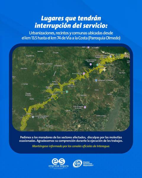 Durante ese período, no habrá servicio en urbanizaciones, recintos y comunas ubicadas entre el kilómetro 13,5 y el kilómetro 174, pertenecientes a la parroquia Olmedo.