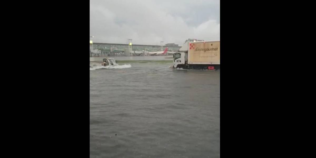 Un video realizado por trabajadores aeroportuarios muestra una parte del aeropuerto donde el agua sobrepasa la altura de las llantas de un camión de servicio de comida para los vuelos.