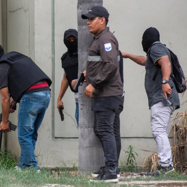 Policías realizaron el martes un operativo en la sede del canal de televisión TC, donde encapuchados armados ingresaron y sometieron a su personal durante una transmisión en vivo, en Guayaquil (Ecuador). ( )