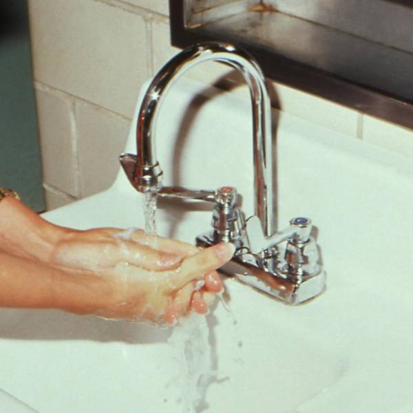 Imagen de una persona lavándose las manos con el agua de un grifo en un baño.( )