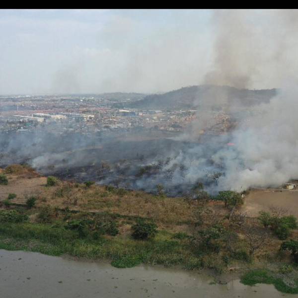 El fuego se observa a los lados de la urbanización La Perla, debajo del puente Vicente Rocafuerte, que conecta a Guayaquil con Daule.