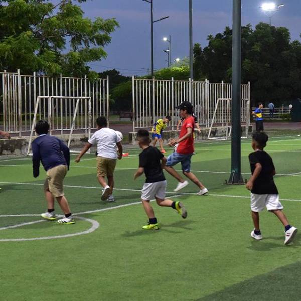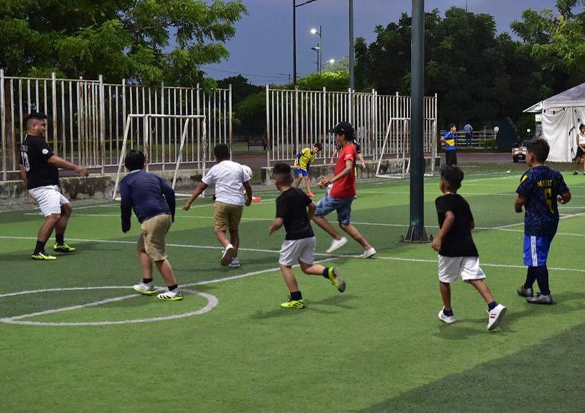 Foto de niños y adolescentes jugando en una de las canchas de césped sintético de Parque Samanes en Guayaquil.( )