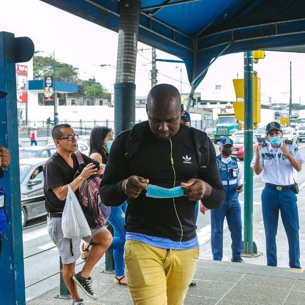 Imagen de un usuario poniéndose una mascarilla ante de ingresar a una parada de Metrovía, un sistema de transporte público de Guayaquil.( )