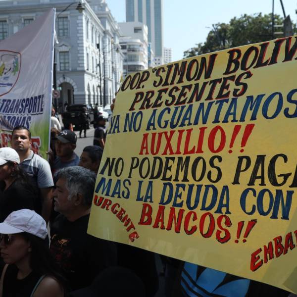 Los transportistas bloquean la avenida Malecón en protesta por un alza de pasajes en Guayaquil