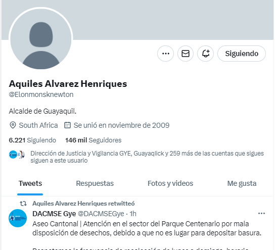 La cuenta de Twitter de Aquiles Álvarez, alcalde de Guayaquil, fue hackeada