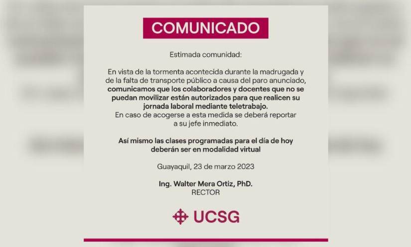 La Universidad Católica Santiago de Guayaquil, mediante un comunicado en su cuenta oficial de Instagram, indicó a sus estudiantes que las clases del día de hoy, jueves 23 de marzo, se darán vía online. Mientras que los docentes que no pueden movilizarse a la institución podrán acogerse al teletrabajo, siempre y cuando se le notifique a su jefe inmediato.