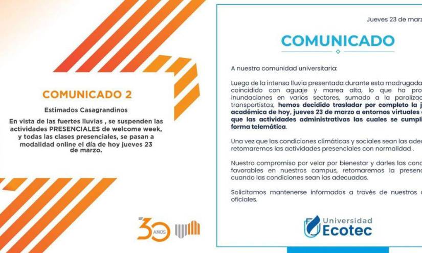 De ideal manera, las universidades Casa Grande y Ecotec, manifestaron por sus vías de contacto oficiales que todas sus actividades se realizarán vía telemática, normativa que se aplica para su personal administrativo y estudiantil.