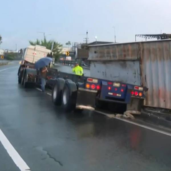 Una camioneta de la Agencia de Tránsito y Movilidad (ATM) bloqueó este acceso hasta la llegada de una grúa suficientemente grande que pueda retirar el tráiler.
