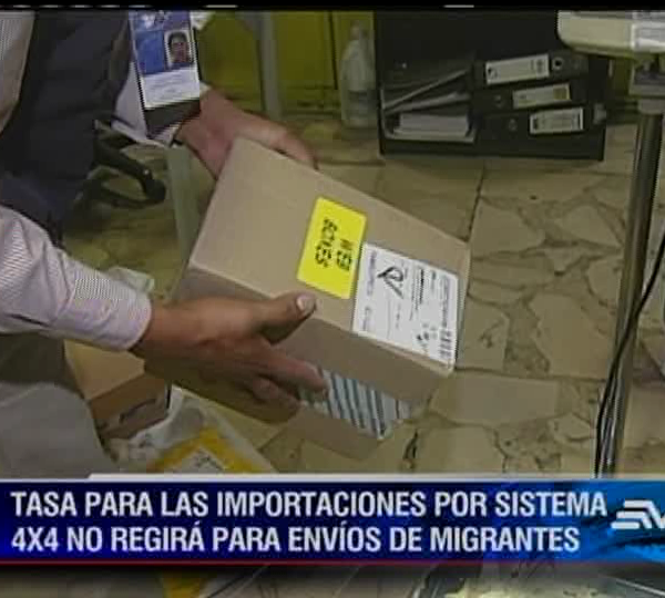 Los familiares de ecuatorianos que viven en el exterior y que envíen paquetes bajo el 4x4 no pagarán los 42 dólares, anunció el ministro de Comercio Exterior, Francisco Rivadeneira: “Lo que queda exceptuado y nuestros migrantes pueden seguir utilizando como un mecanismo más barato para poder hacer, o si no quieren usar este mecanismo de los courier, es obviamente el sistema postal normal, que no paga los 42 dólares”.