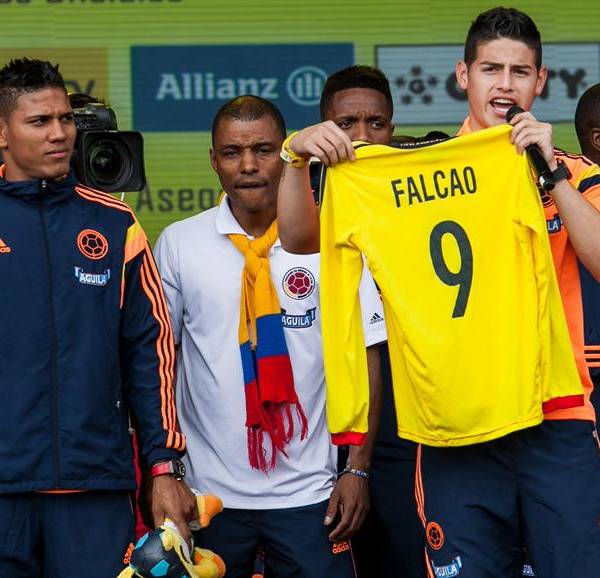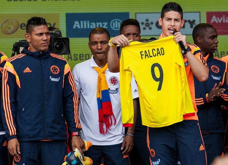 La estrella de la Selección colombiana de fútbol, James Rodríguez, recordó hoy en el recibimiento multitudinario en Bogotá a varios jugadores que por diferentes motivos no pudieron estar en el Mundial de Brasil, entre ellos a su compañero de equipo en el Mónaco Radamel Falcao García. (Visite nuestra galería de fotos)