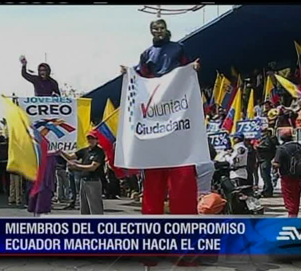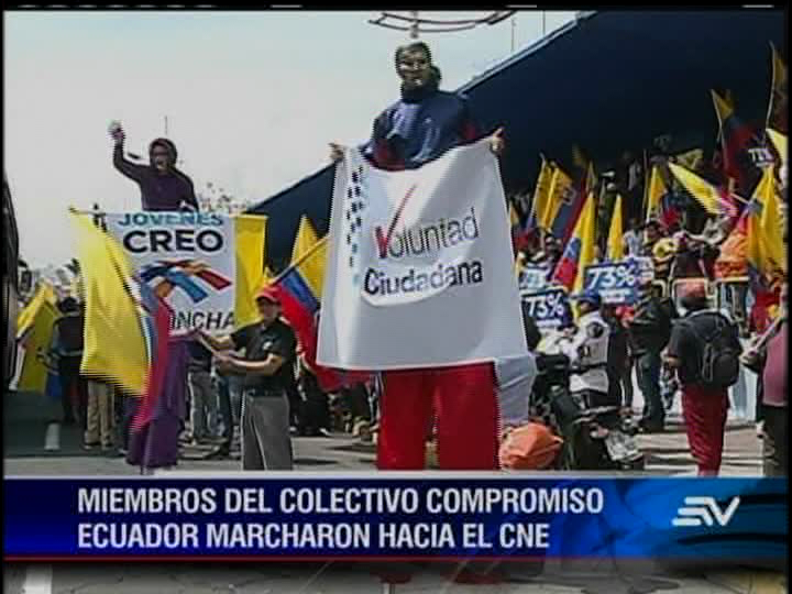Caminaron varias cuadras gritando consignas hasta el CNE. Lasso encabezó una comisión que fue recibida por el secretario del organismo, Álex Guerra, en la sala de sesiones. Ahí Lasso entregó la pregunta para solicitar los formularios: “'¿Está usted de acuerdo en que se modifique la Constitución para permitir la reelección indefinida del presidente de la República y otras dignidades de elección popular?' Nuestra propuesta será no”.