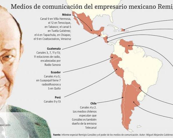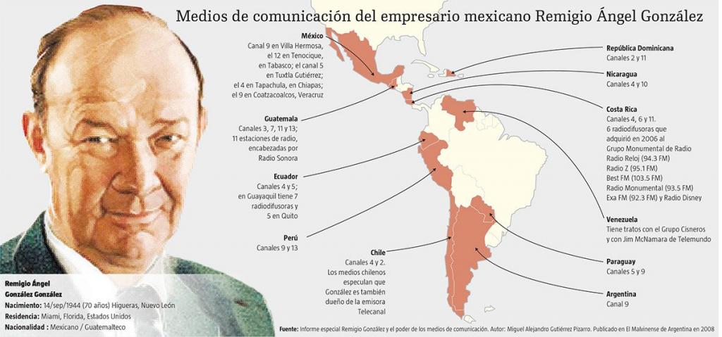 Este informe presenta una infografía basada en datos del 2008 del diario El Malvinense de Argentina, donde se muestran los 11 paises en los que González tiene 25 canales de televisión y cerca de 30 radiodifuras, entre esos paises figura Ecuador.