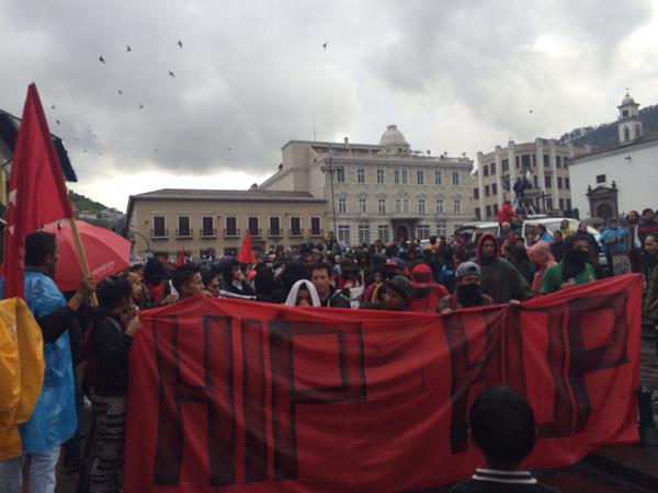 La marcha convocada por varias organizaciones sociales y sindicales ha llegado a la Plaza de San Francisco, centro de Quito, mientras cae una fuerte lluvia en varios sectores de la capital.