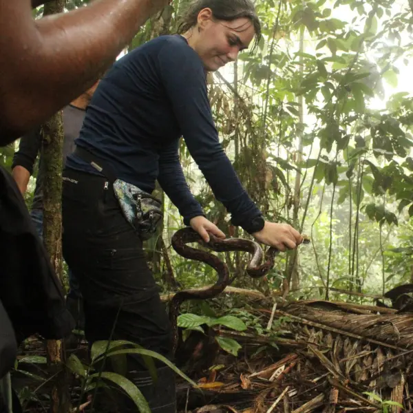 A pocos metros, el recorrido cambia de atmósfera. Entre troncos secos aparecen anacondas y boas constrictor, una de las especies más rescatadas, debido a su aparición en zonas agrícolas donde con frecuencia son atacadas. Veterinarios evalúan si pueden ser reinsertadas. Miden su cuerpo, revisan el grosor y confirman que la dentadura esté completa.
