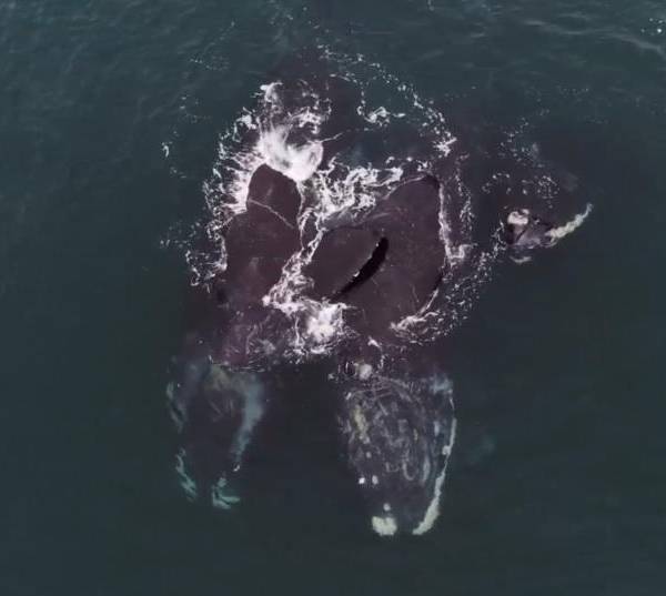 Científicos de Woods Hole indicaron que dicho comportamiento rara vez es observado y que posiblemente sea la primera vez que se graba un abrazo entre ballenas desde el aire.