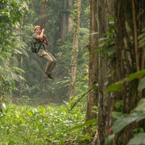 Entre los árboles aparecen pazos y guabas, alimento para cerca de 300 especies de aves, entre ellas tangaras, loros y el tucán pechiblanco.