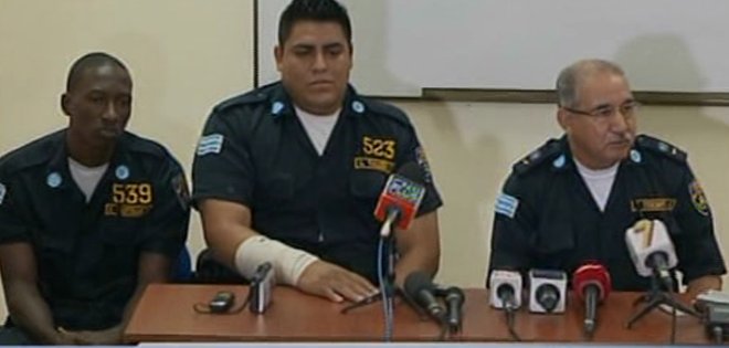 En rueda de prensa este jueves 10 de septiembre del 2015, en el cuartel de la Policía Metropolitana, los uniformados Luis Valero y Joffre Castillo no solo negaron ser los agresores sino que aseguraron haber sido ellos los agredidos.