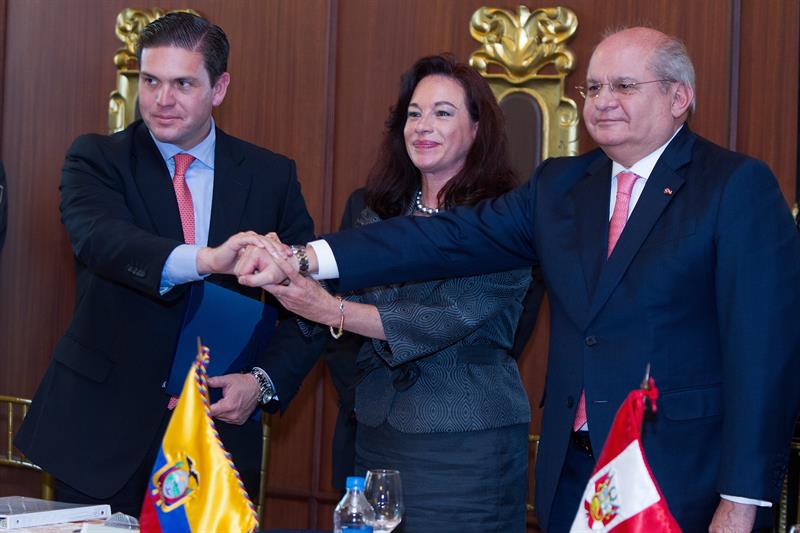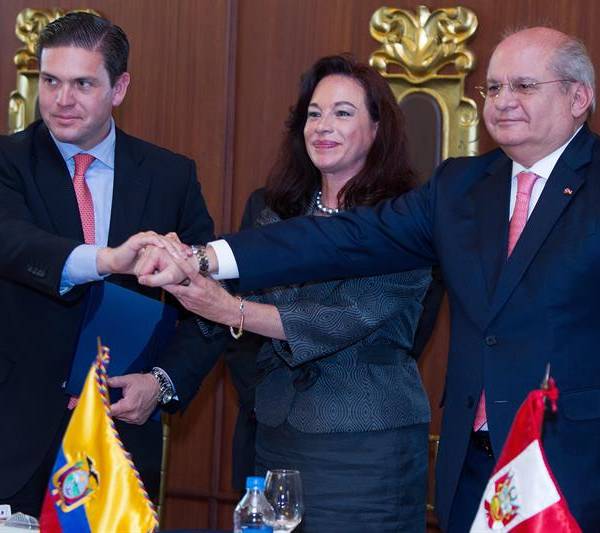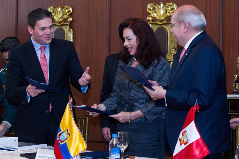 Los ministros de Defensa de Ecuador, María Fernanda Espinosa; Colombia, Juan Carlos Pinzón y Perú, Pedro Cateriano, estrecharon hoy las relaciones de cooperación que les unen durante su primera reunión a tres bandas, que calificaron de histórica para las relaciones de vecindad.
