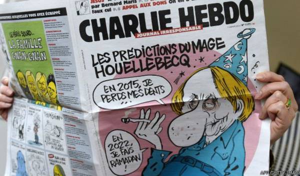 La portada de Charlie Hebdo de esta semana muestra una caricatura del controvertido autor francés Michel Houellebecq, cuya última novela, Sumisión, imagina una Francia liderada por un partido islámico.