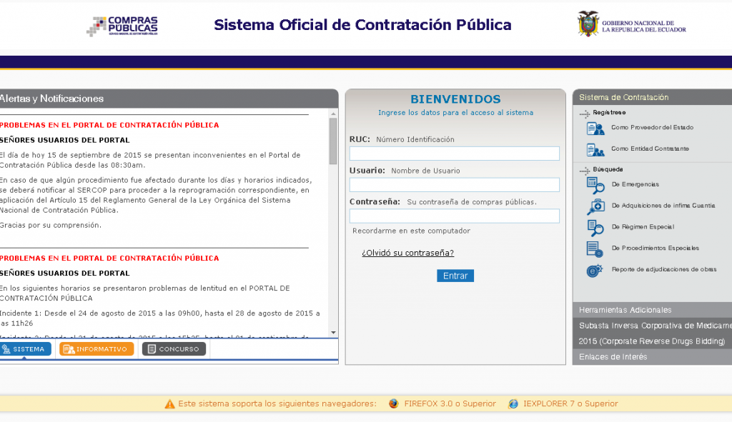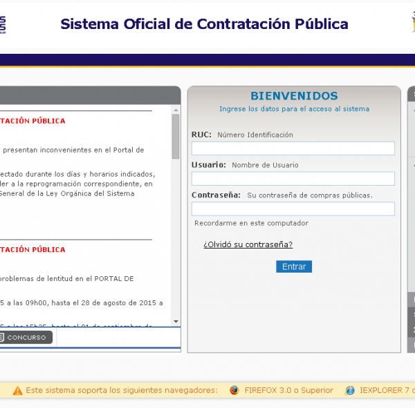 Sin embargo, en el sitio web del Sercop, en la sección de Alertas y Notificaciones se detalla que desde el 15 de septiembre “presentan inconvenientes en el Portal de Contratación Pública desde las 8:30”. Señala además que “en caso de que algún procedimiento fuese afectado durante los días horarios indicados se deberá notificar al Sercop para proceder a la reprogramación correspondiente”.