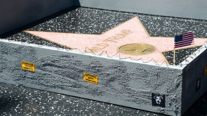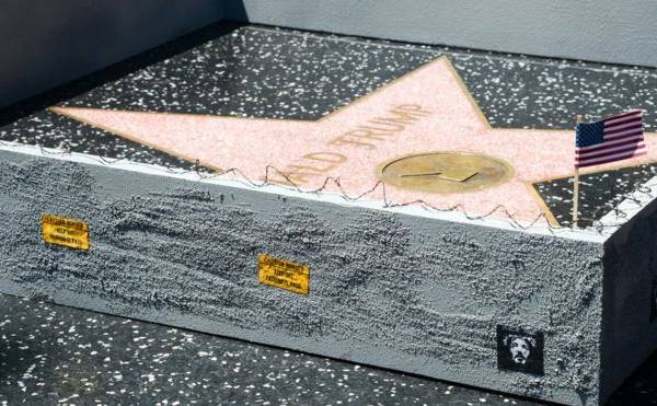 La estrella del magnate y candidato presidencial republicano en el Paseo de la Fama de Hollywood apareció rodeada de un muro de 15 centímetros, con alambres y letreros de "prohibido el paso".