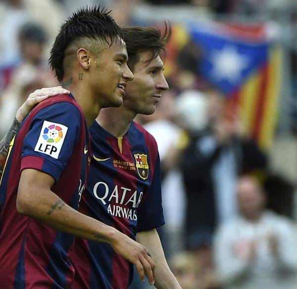 El brasileño Neymar (I) y el argentino Lionel Messi durante un pa -