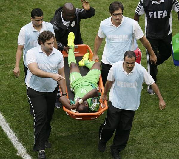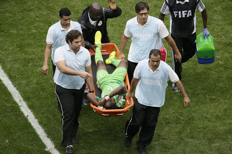 El centrocampista de Nigeria Ogenyi Onezi sufre una fractura de tibia y peroné, que se produjo como consecuencia de una entrada de Blaise Matuidi, en el transcurso del choque entre el conjunto africano y Francia, de los octavos de final del Mundial 2014.