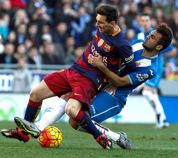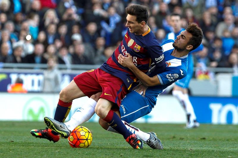 BARCELONA, España.- Messi no pudo escapar de la marca. Foto: EFE.
