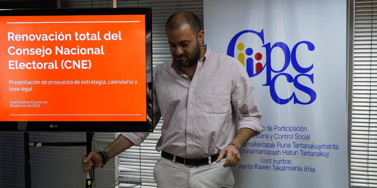 El consejero del Cpccs, Juan Esteban Guarderas, expuso este viernes 28 de junio una metodología para que la renovación total de los vocales del Consejo Nacional Electoral (CNE) se cumpla hasta noviembre de este 2024, cuando ellos terminan su periodo de seis años.