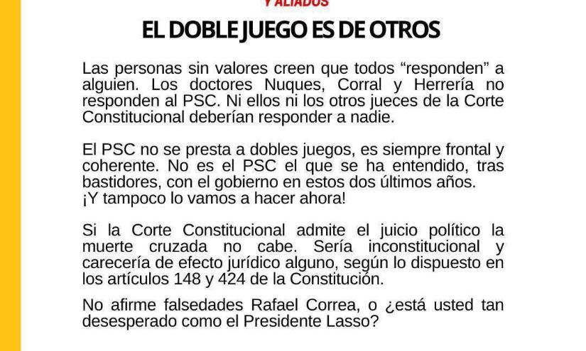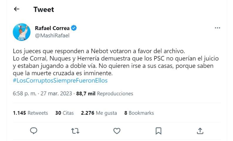 En la confrontación, el primero en lanzar la piedra fue Rafael Correa, quien escribió en en Twitter: "Los jueces que responden a (Jaime) Nebot votaron a favor del archivo. Lo de Corral, Nuques y Herrería demuestra que los PSC no querían el juicio y estaban jugando a doble vía. No quieren irse a sus casas, porque saben que la muerte cruzada es inminente".