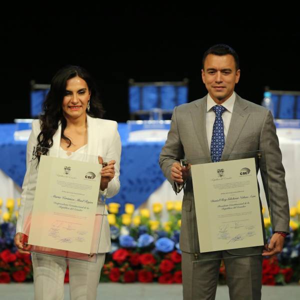 Verónica Abad y Daniel Noboa durante la entrega de credenciales en el CNE el 15 de noviembre de 2023.( )