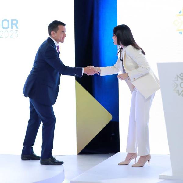 Saludos entre Daniel Noboa y Luisa González en el debate electoral de las elecciones anticipadas de octubre 2023.( )