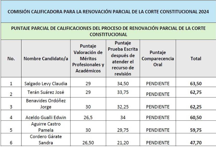 Claudia Salgado, José Terán y Jorge Benavides son los virtuales ganadores del concurso para la renovación parcial de jueces de la Corte Constitucional. El 19 de febrero, la comisión calificadora publicó los puntajes parciales del proceso, en los que aún está pendiente la calificación de la comparecencia oral.