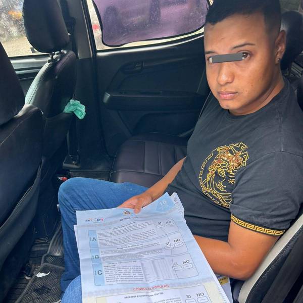 El ministro del Interior, Jhon Reinberg, informó este domingo 16 de noviembre que la Policía Nacional aprehendió a un ciudadano en Tonchigue, Esmeraldas, luego de que intentara ingresar cinco papeletas falsas y alteradas a un recinto dentro del proceso de votación de la Consulta Popular y Referéndum 2025.
