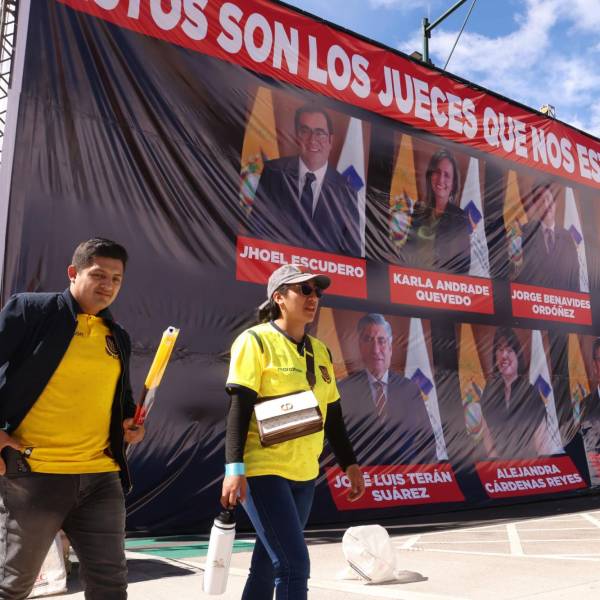 Simpatizantes del presidente Daniel Noboa arremetieron contra los jueces de la Corte Constitucional divulgando sus fotos en pancartas y señalándolos de evitar que el Gobierno mitigue la inseguridad.