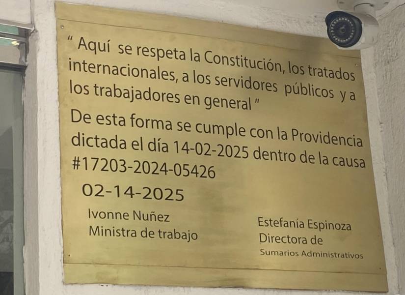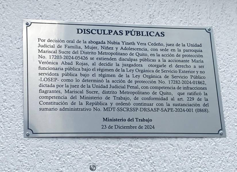 La jueza Nubia Vera llegó hasta el edificio del Ministerio del Trabajo, en Quito, para verificar el cumplimiento de la sentencia que dispone ofrecer disculpas públicas a la vicepresidenta Verónica Abad. Esto, luego de que diera un ultimátum a la ministra Ivonne Núñez, al encontrar, el 12 de febrero, una placa ilegible con un texto distinto al ordenado.