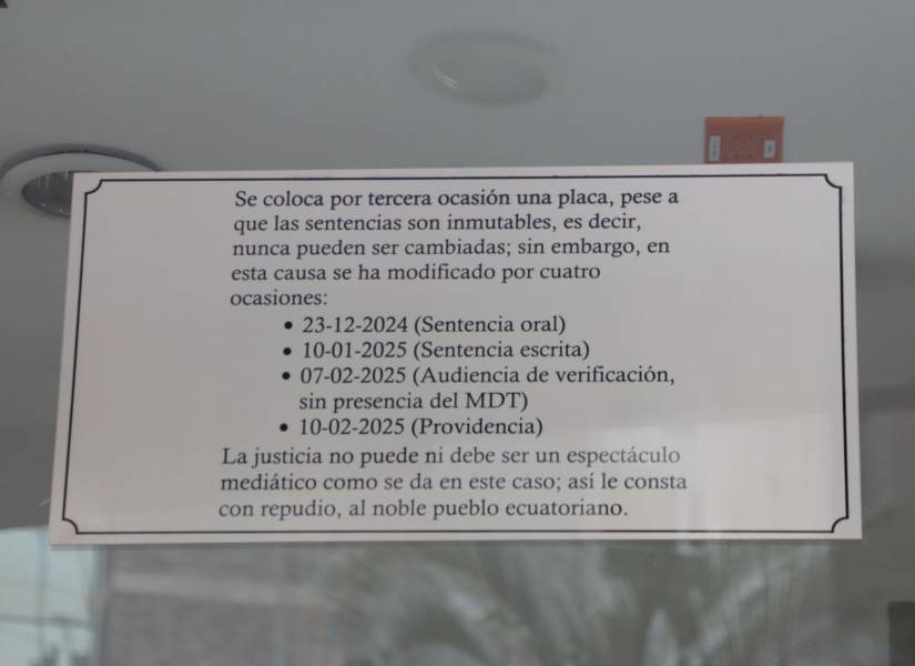 Una tiene el texto ordenado, otra tiene las disculpas públicas, la cuarta es la placa ilegible y la última es una en que se acusa a la magistrada de haber cambiado cuatro veces la sentencia. Ahí se lee: "La justicia no puede ni debe ser un espectáculo mediático, como se da en este caso, así le consta, con repudio, al noble pueblo ecuatoriano".