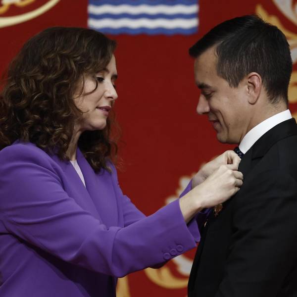 Después del desayuno organizado por el Ceapi , Noboa se reunió con la presidenta de la Comunidad de Madrid, Isabel Díaz Ayuso, quien le impuso la Medalla Internacional de esa región española, la máxima distinción que otorga.