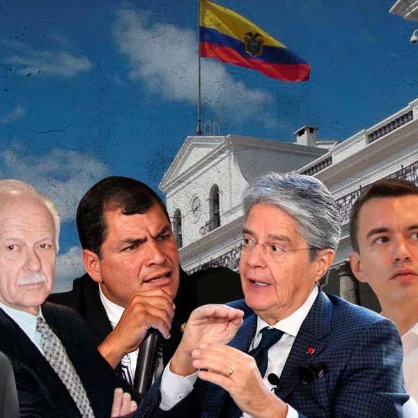 Ilustración de cinco presidentes: Rodrigo Borja, Sixto Durán Ballén, Rafael Correa, Guillermo Lasso y Daniel Noboa( )