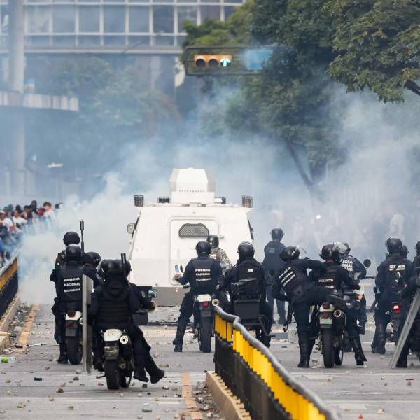 Fotografía de archivo de integrantes de la Policía Nacional Bolivariana (PNB) y la Guardia Nacional Bolivariana (GNB) mientras se enfrentan a manifestantes opositores durante una protesta contra de los resultados de las elecciones presidenciales del pasado 28 de julio, en Caracas (Venezuela). ( )