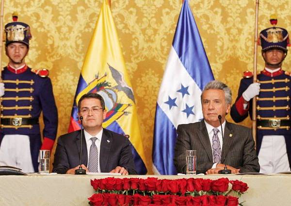 El presidente de la República, Lenín Moreno, y su homólogo hondureño Juan Orlando Hernández, firmaron el Acuerdo de Alcance Parcial de Complementación Económica, durante una reunión de trabajo en el palacio de Carondelet en Quito, el 13 de octubre de 2017.