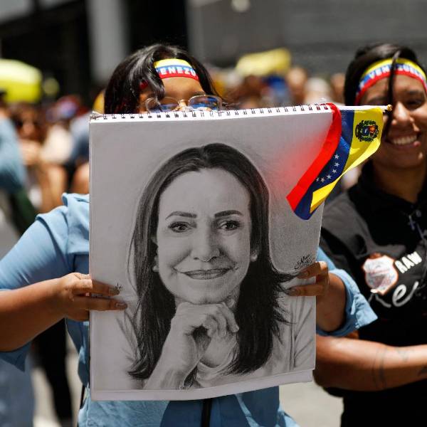 Imagen de agosto de 2024. Simpatizantes sostienen un retrato de María Corina Machado en una protesta en Caracas, Venezuela. ( )