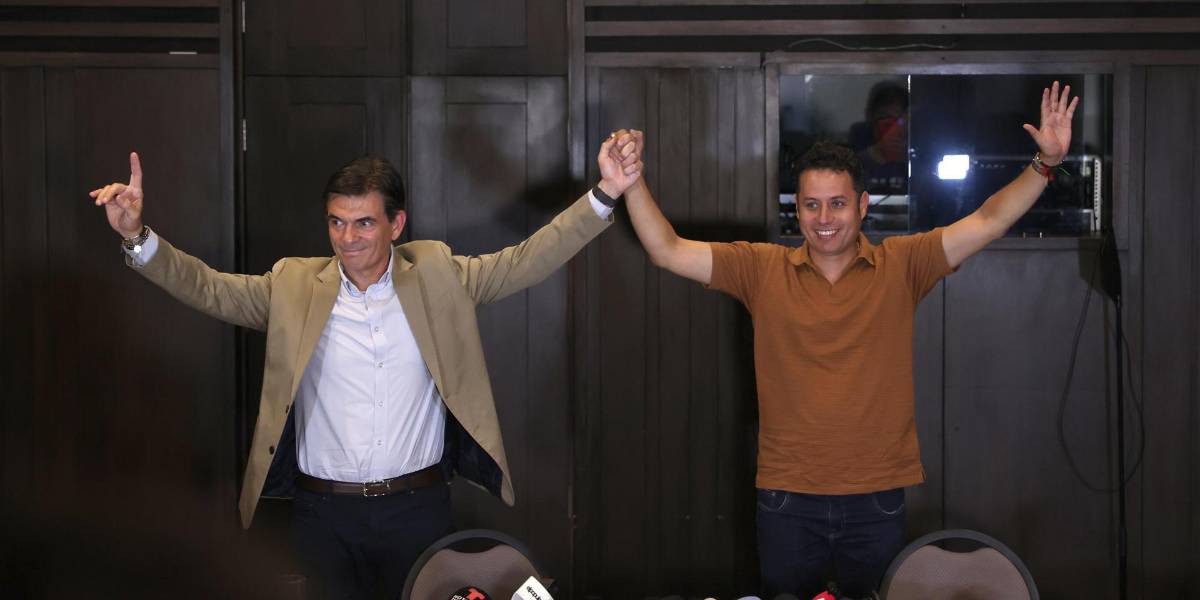 El candidato ganador de la segunda vuelta de las elecciones presidenciales, Rodrigo Paz (i), junto con su compañero de fórmula, Edman Lara.( )